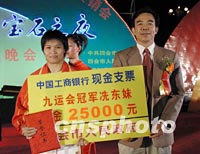 廣東肇慶四會籍選手冼東妹(左)在九運會上奪得五十二公斤級柔道冠軍,肇慶四會市特別獎勵她25000元人民幣。圖為市委書記龍紅輝八日親手把現金支票送到冼東妹手中。中新社圖 黃耀輝 攝