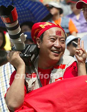 中國隊十三日在漢城世界杯體育場迎戰土耳其隊,圖為著名相聲演員牛群觀戰助威。作者:毛建軍