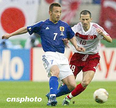 圖:1/8決賽日本VS土爾其 中田英壽與厄爾岡爭搶 2002年06月18日 15:51 ![]() 6月18日下午,韓日世界杯第7場1/8決賽日本隊與土爾其隊的比賽在日本仙臺利府町體育場進行,目前比賽正在進行,場上比分為土爾其隊1-0領先。圖為中田英壽(左)與厄爾岡(右)爭搶。