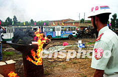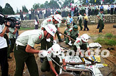 組圖:云南銷毀一批假冒軍車和假牌照假印章 2002年07月22日 20:52 ![]() 銷毀現場 ![]() 銷毀假冒軍車現場 ![]() 銷毀假冒牌照現場 22日下午,云南省銷毀假冒軍警車輛現場會在昆明市小板橋洋浦頭舉行,共銷毀了四十多輛假冒軍用車輛,以及一批假冒軍用牌照和印章。該省近年共查獲假冒軍人案三百一十多起、假冒軍隊企業三十一家、假冒軍車達二百二十六輛。