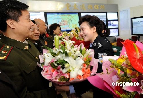 3月8日,國際婦女節,出席十一屆全國政協會議的部分文藝界政協委員來到北京人民大會堂交通指揮所,向為兩會服務的女交警們獻上鮮花,表達節日的祝賀。中新社發 劉英毅 攝