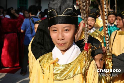 十月五日舉行的臺北祭孔大典上,大龍小學的佾生伴著樂曲起舞,要完成九十六個舞蹈動作,佾生們要練一年以上并寫出動作記錄才能記住,因此被戲稱為大龍小學的“秘笈”。圖為可愛的小佾生。中新社發 楊旭 攝