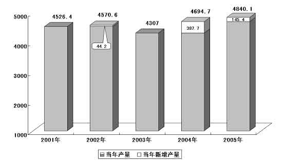 圖表三 “十五”期間糧食產量及增產情況 (單位:億公斤)