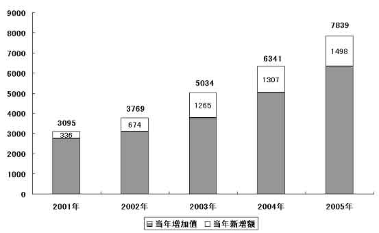 圖表四 “十五”期間規模以上高技術產業增加值增長情況 (單位:億元)
