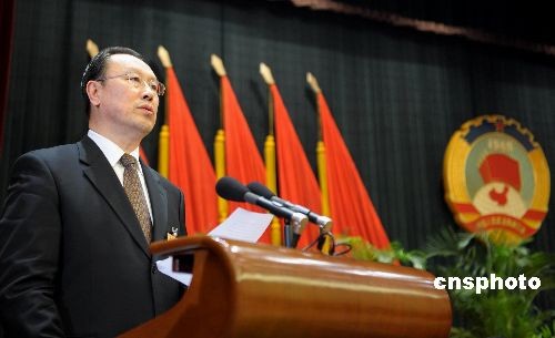 三月九日,全國政協十一屆一次會議主席團在北京全國政協禮堂舉行第二次會議。中共中央統戰部部長杜青林,就中共中央向政協十一屆一次會議推薦的新一屆全國政協主席、副主席、秘書長、常務委員建議人選名單作說明。中新社發 廖攀 攝