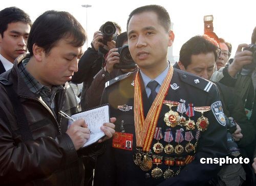 三月五日,來自江西的全國人大代表萬凱身著警服、胸前佩滿勛章,出席十一屆全國人大一次會議開幕會,吸引眾多記者。中新社發(fā) 潘索菲 攝