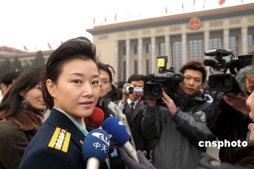 三月八日上午,全國政協十一屆一次會議第二次全體會議在北京人民大會堂舉行,會前,各路媒體記者在大會堂前的天安門廣場追訪家喻戶曉的歌星宋祖英委員。中新社發 廖攀 攝