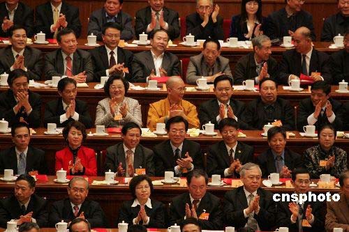 三月十三日下午,全國政協十一屆一次會議舉行第四次全體會議,選舉產生十一屆全國政協主席、副主席、秘書長、常務委員。圖為選舉結果公布后,全體委員鼓掌慶賀。中新社發 潘索菲 攝