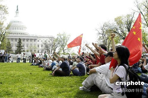 當地時間4月19日,近千名中國留學生和當地的華僑華人在美國國會山前舉行示威活動,支持北京奧運,反對CNN丑化中國的評論。圖為千名留學生在國會山前振臂高呼:“不要歪曲報道!不要支持暴力!支持和平,支持奧運!” 中新社發 邱江波 攝