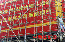 歡迎江澤民標語出現澳門 。15日,歡迎江澤民蒞臨澳門的標語出現在中央人民政府駐澳聯絡辦門前,工人抓緊時間油漆標語。中新社記者滿會喬攝