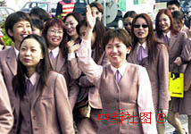 澳門回歸一周年即將到來之際,澳門婦女聯合會的一群女青年在慶祝活動中開心一笑。中新社傳真宗金柱攝