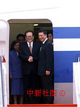 ![]() 何厚鏵陪江澤民與王冶坪下機(jī).國(guó)家主席江澤民與夫人王冶坪在澳門特區(qū)行政長(zhǎng)官何厚鏵的陪同下,于19日下午乘專機(jī)抵達(dá)澳門機(jī)場(chǎng),出席澳門回歸祖國(guó)一周年慶典活動(dòng),江澤民主要陪同人員錢其琛等同機(jī)抵達(dá)。中新社傳真 滿會(huì)喬攝 |