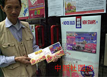圖文:澳門郵政局20日發行澳門特區成立一周年紀念郵票 2000年12月20日 13:51 ![]() 澳門郵政局20日發行澳門特區成立一周年紀念郵票,專門從香港乘早班船到澳門訂購郵票的朱炳然先生高興的展示排隊選購到的紀念郵票。中新社傳真洪少葵攝