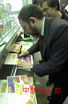 20日上午澳門發行澳門特區成立一周年紀念郵票,郵政局官員欣然為紀念郵票購買者簽名。中新社傳真彭偉祥攝