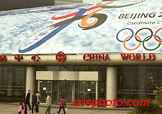 北京國際貿易中心的透明半拱型屋頂上新裝飾了申奧宣傳海報,碩大的申奧標志顯得十分醒目。中新社圖 陸云 攝