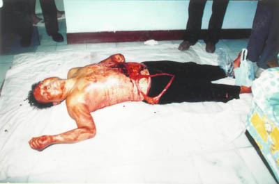 圖:馬健民剖腹尋“法輪” 2001年3月23日 16:55 ![]() 馬健民,男,54歲,華北油田退休職工。其家人稱,馬已練習(xí)“法輪功”兩年左右,達(dá)到了癡迷的程度,時(shí)常出現(xiàn)精神恍惚和失常,堅(jiān)持認(rèn)為自己的腹部有個(gè)“法輪”。1998年9月4日馬健民在家中用剪刀剖腹尋找,因救治不及時(shí)死亡。這是馬健民自殺后的慘景。新華社發(fā) |