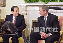 美國總統布什二十二日在白宮會見中國國務院副總理錢其琛時說,他期待著今年秋天到中國訪問。中新社圖 京華 攝