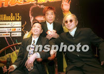 歌星許志安9日在香港出席其「借你耳朵聽許志安演唱會」記者會,許志安感謝張耀榮(左)、黃柏高(右)在演藝事業上對他的支持。中新社傳真 鄧慶樂 攝