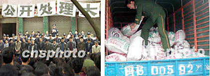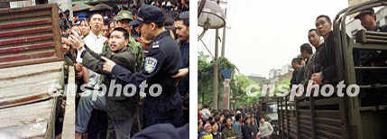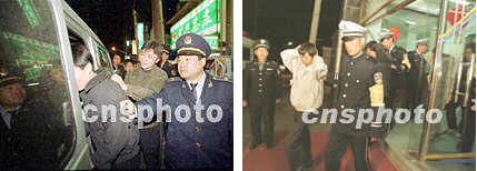 新聞組圖:中國(guó)各地嚴(yán)打行動(dòng) 2001年4月25日 10:04 ![]() 圖(1) 圖(2) ![]() 圖(3) 圖(4) ![]() 圖(5) 圖(6) 圖(1)說明:北京西城公安分局、工商局日前聯(lián)合在夜間清理音像市場(chǎng),當(dāng)場(chǎng)抓獲販賣盜版光盤人員十余名。中新社記者宋吉河攝 圖(2)說明:北京公安西城公安分局日前夜間收容外地進(jìn)京“三無”人員,全面整頓社會(huì)治安。中新社記者宋吉河攝 圖(3)說明:重慶市巴南區(qū)二十四日在電影院廣場(chǎng)前公開審判十九名刑事犯罪分子,上千名當(dāng)?shù)厝罕妳⒓恿舜髸?huì),無不拍手稱快。中新社記者趙振清攝 圖(4)說明:福清市公安邊防大隊(duì)官兵,23日凌晨在“治爆緝槍專項(xiàng)行動(dòng)”中,先后破獲二起特大偷運(yùn)、私藏炸藥案,共查獲土制銨油炸藥5000多公斤、雷管283枚、導(dǎo)火索250米。圖為一名邊防警員在福清海口鎮(zhèn)方新村官下尾路段攔檢一輛裝載有土制銨油炸藥的可疑貨車。中新社圖賀錕陳暉攝 圖(5)說明:中國(guó)重慶市巴南區(qū)二十四日在該區(qū)電影院廣場(chǎng)前公開審判十九名刑事犯罪分子,當(dāng)?shù)厣锨忻駠^犯罪分子被押上刑車,送往監(jiān)獄的過程。中新社記者趙振清攝 圖(6)說明:中國(guó)重慶市巴南區(qū)二十四日在該區(qū)影院廣場(chǎng)公開審判十九名刑事犯罪分子,當(dāng)?shù)厍忻瘳F(xiàn)場(chǎng)目睹犯罪分子被押上刑車,送往監(jiān)獄的過程。中新社記者趙振清攝 |