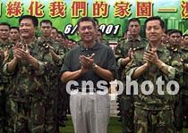 中國人民解放軍駐澳部隊六日首次參與當?shù)刂矘浠顒樱瑘D為特區(qū)政府行政長官何厚鏵與駐澳部隊司令員劉粵軍(左)、政委劉良凱及參與植樹活動的二百名士兵合影留念。中新社記者 宗金柱 攝