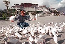 西藏拉薩市布達拉宮廣場上,新從內地引進數百羽雪白的信鴿與市民及游客作伴、嬉戲。成為市區一新景觀。中新社記者 鄒憲 攝