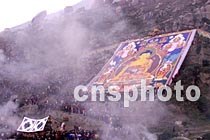 西藏拉薩市藏族市民十一日開始歡度當地盛大民族節日雪頓節,清晨在哲蚌寺舉行了曬佛儀式。中新社圖 趙偉 攝