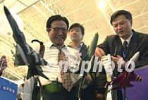 中國航空博物館五月在北京國際科技博覽會上展示國產(chǎn)新型戰(zhàn)機模型,一名臺灣商人頗感興趣地商洽訂貨,其中包括海南中美撞機事件里的殲八型戰(zhàn)機模型。中新社記者 賈國榮 攝