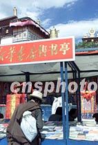 西藏拉薩大昭寺前的新華書店吸引了遠道前來朝圣的藏民駐足觀看。西藏藏民的文化生活水平日漸提高。中新社記者 滿會喬 攝