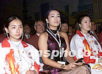 7月13日,國際奧委會112次會議在莫斯科世界貿易中心舉行會議,表決2008年奧運會舉辦城市。圖為北京申奧代表員成員們劉璇、鞏俐、王楠(左至右)到場聆聽北京代表團陳述報告。中新社記者 王瑤 攝