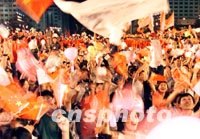 ![]() 北京各大高校的學(xué)生十三日晚在北京中華世紀壇和市民一同歡慶北京申奧成功。中新社記者 滿會喬 攝