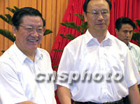 圖:原海南省委書記杜青林向新省委書記白克明“交班” 2001年08月16日 21:05 ![]() 八月十五日上午,中共海南省委召開干部大會。中共中央組織部副部長黃晴宜宣布:杜青林不再擔任海南省委書記職務,另有任用;任命白克明接任中共海南省委書記職務。在海南工作了九年多的杜青林與剛剛履新的白克明握手“交班”。中新社記者 關向東 攝