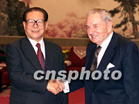 中國國家主席江澤民二十八日在北京中南海會(huì)見美國銀行家洛克菲勒先生。中新社記者 毛建軍 攝