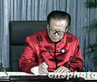 10月21日,出席2001年亞太經合組織領導人非正式會議的中國國家主席江澤民在上?萍拣^簽名留念。中新社圖