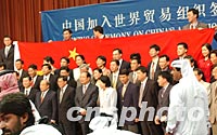 圖:中國代表團(tuán)成員在國旗前留念 2001年11月12日 02:46 ![]() 北京時間12日中國代表團(tuán)成員在多哈展示中國國旗,慶祝中國入世。中新社記者 錢興強(qiáng) 攝 |