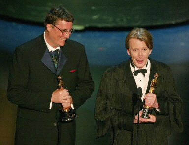 圖文:影片《指環王》獲奧斯卡最佳化妝獎 2002年03月25日 10:23 中新網北京3月25日消息:《指環王》獲得最佳化妝獎,理查德·泰勒和匹特·歐文接過奧斯卡金人,此外,該片還獲得了最佳攝影大獎。(法新圖)