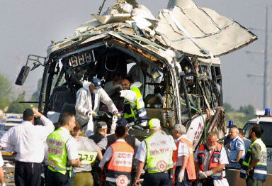 多圖:海法發生汽車炸彈爆炸事件 哈馬斯宣布負責 2002年04月10日 17:01 ![]() 以色列警方在檢查爆炸汽車的殘骸 ![]() 救援人員將遇難者尸體從汽車殘骸內抬出 中新網北京4月10日消息:當地時間4月10日早(北京時間10日中午),以色列北部港口城市海法發生一起自殺爆炸事件,至少造成10人死亡,另有20人受傷。 爆炸發生在一輛公共汽車上,這輛車是從海法開往耶路撒冷的。以色列方面稱此次爆炸為“恐怖襲擊”,哈馬斯組織已經宣布對此次爆炸事件負責。 爆炸發生前幾小時,以軍曾于黎明時分向約旦河西岸最大城市納布盧斯的巴勒斯坦難民營發動進攻,現場可見煙火沖天,以軍炮火、重機槍頻頻開火,以軍直升機也發射了多枚導彈。杰寧也發生了交火。 爆炸給海法帶來巨大恐慌,3月31日,海法一家餐廳就曾發生一起自殺性爆炸事件,造成16人喪生。昨晚,以軍士兵在約旦河西岸城市杰寧的難民營遭到伏擊,13人喪生,9人受傷。這是近18個月來以色列方面發生的最嚴重單起傷亡事件。以色列總理沙龍隨后稱,以軍在約旦河西岸的軍事行動將繼續,直到將巴勒斯坦武裝分子徹底鏟除。(春風)