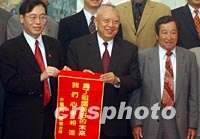 董建華會見臺灣"中國統一聯盟一國兩制參訪團" 2002年04月11日 08:38 ![]() 香港特區行政長官董建華,4月10日在香港禮賓府會見臺灣中國統一聯盟“一國兩制參訪團”,團長王津平(左一)向董建華贈送錦旗。中新社記者 任晨鳴 攝