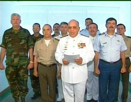 ![]() 當(dāng)?shù)貢r(shí)間4月11日,委內(nèi)瑞拉海軍參謀長拉米雷茲-佩雷斯(前方著白衣者)代表30名軍官通過錄像帶宣布,不承認(rèn)查韋斯總統(tǒng)。