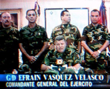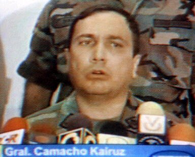 多圖:委內瑞拉高級將領發表電視講話加入叛軍 2002年04月12日 12:22 ![]() 委內瑞拉當地時間4月11日晚(北京時間12日上午),國民警衛隊的卡伊魯茲將軍宣布,總統查韋斯的政府已經"不再履行其職能",全國局勢已經被軍隊控制。此前已有多名高級軍官宣布不承認總統查韋斯,并要求其下臺。圖為委內瑞拉軍隊司(中).(春風)