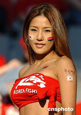 2002韓日世界杯半決賽第一場比賽韓國隊與德國隊的比賽將于6月25日晚在漢城進行,圖為韓國女球迷性感亮相。