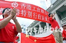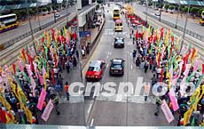 ![]() 香港工會聯合會,6月30日發起盛大巡游,慶祝香港特區成立五周年,圖為近三千名市民組成的巡游隊伍浩浩蕩蕩的途徑中區鬧市。中新社傳真 洪少葵 攝
