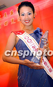 ![]() 二十一歲的香港大學生蔡潔雯在二00二年度香港小姐競選中,獲得卓越才藝小姐大獎。她表示努力成為一個成功藝人。洪少葵 攝