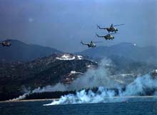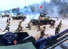 解放軍東海聯合演練 高科技與實戰融為一體(圖) 2002年08月19日 08:32 ![]() 步坦協同,席卷敵陣 ![]() 戰鷹突破空中防線 ![]() 獵潛艇劈波斬浪 ![]() 直升機臨空支援 中新網北京8月19日消息:中國官方媒體人民網昨晚發表解放軍在東海演習的照片,從照片中可以看到演習動用了坦克、軍艦、戰機和直升機。 據人民網報道,東海某海域進行三軍聯合作戰演習的南京軍區隊及配屬的海空軍隊,把現代高科技與未來實戰需要融為一體,為全面掌握現代戰爭的特點和主動權﹑制勝權。 報道指,三軍將士以飽滿的熱情真打真練,能謀善戰,斗志高昂,樹立了敢打必勝的信心。