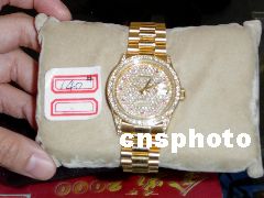 圖為起拍價為五萬七千四百元的“勞力士”手表,據拍賣行介紹,該表表芯為原裝,“滿天星”表面是后來鑲嵌上的。