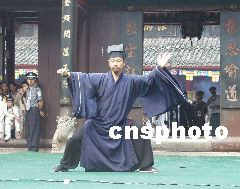 少林、武當、峨眉三大武術門派精英賽二日下午在峨眉山下報國寺舉行,圖為武當派掌門人游玄德宗師向觀眾展示的武當太乙逍遙拳。作者:魯彥
