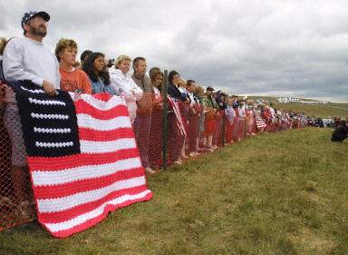 在匹茨堡東南70英里的阿帕拉奇安高低的這片露天礦上,聚集了數千名民眾,包括500多名遇難者的家屬。他們很多人飽含熱淚,在陰沉的天空下緊握著美國國旗。當地時間上午10:00,正是一年前那架波音757客機以大約500英里的時速墜毀在這片空地上。當被美國總統布什譽為英雄的33名遇難乘客和7名殉職的機組人員名單被宣讀時,一座百年歷史的教會鐘悠然響起。