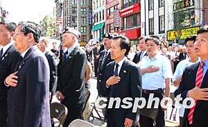 美國東部時間九月十一日中午,紐約華人在華埠的林則徐廣場舉行獻花儀式,悼念“九一一”罹難者。作者:黃克鏘