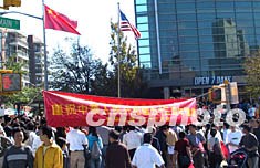 當地時間九月二十九日中午,在熱鬧的紐約法拉盛緬街上,飄揚起一面五星紅旗。紐約華人今天在此舉行升旗儀式,慶祝中華人民共和國成立五十三周年。作者:趙海燕