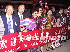 專程從泰王國飛抵海口迎接詩琳通公主的一百多名泰國海南鄉親,在機場拉起了寫著泰文與中文的橫幅,揮舞著中國、泰國國旗,在十五的滿月下笑迎詩琳通公主。