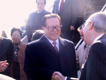 中美兩國為江澤民此次訪美作了大量準(zhǔn)備工作。今天,當(dāng)江澤民的專機(jī)降落在芝加哥奧海爾國際機(jī)場(chǎng)時(shí),受到了芝加哥市市長(zhǎng)戴利和夫人、伊利諾伊州副州長(zhǎng)本豪森、美國駐華大使雷德以及當(dāng)?shù)厝A僑華人、留學(xué)生代表的熱烈歡迎。